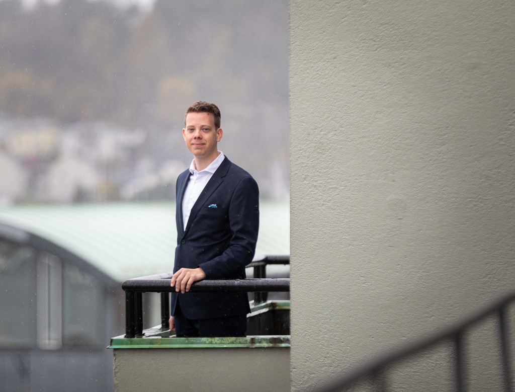 31-åringen speider ut fra balkongen øverst i Thor Dahl-bygget, og signalene fra oven er ikke spesielt oppløftende denne tidlige morgenen i mai. Det er ingen kirketårn å spore utenfor bankens lokaler, og regnet plasker ned i havnebassenget.